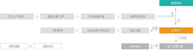 6、售后工程師完成維修后,將客戶評價表及款項交送部門助理,由部門助理對本次服務(wù)的客戶滿意度進行回訪及辦理款項核實事宜,并將資料錄入CRM系統(tǒng)后歸檔,再由專人回訪并聽取客戶評價。